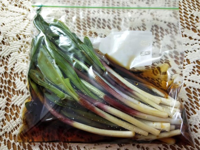 おはようございます😃この時期、道内ではスーパーでも手に入る行者ニンニク(キトビロ、アイヌネギ)。麺つゆ、お酒、醤油とともにジップロックに。少し置いたらそのまま冷凍。食べるときは自然解凍。お料理上手の奥さんから教わった簡単レシピ、毎年重宝してます。 pic.twitter.com/cgUvkpd3TO